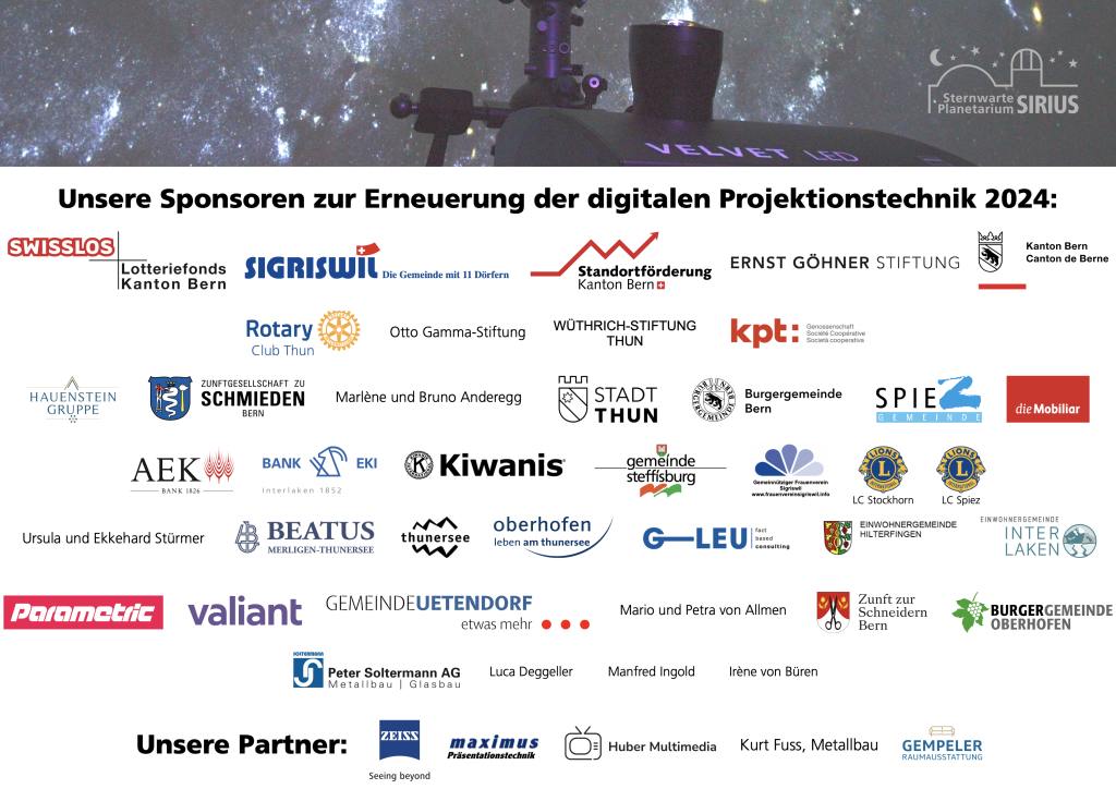 Die Erneuerung der digitalen Projektionstechnik im Planetarium wurde 2024 einzig durch die finanziellen Zuwendungen von folgenden Institutionen, Gemeinden und Privaten ermöglicht: